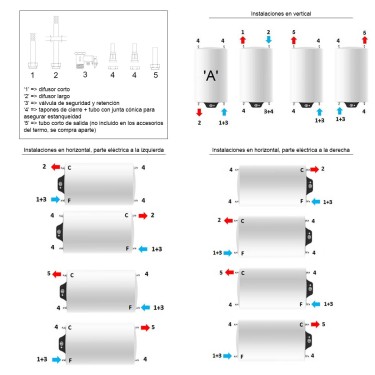 - 4 tubos de entrada/salida al termo: instalación multiposicional con 12 posibilidades