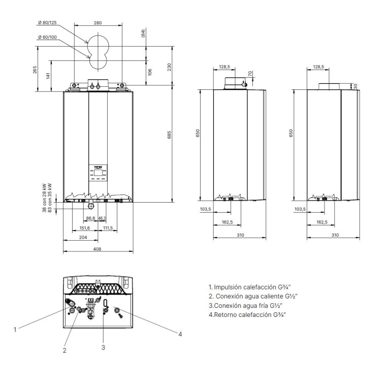- Rango de potencia de producción de ACS: 6,7-34,0Kw.