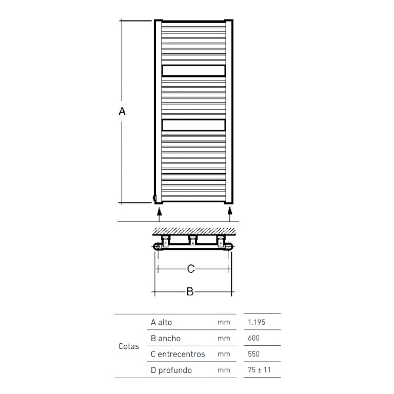 - Medidas: 600 x 75 ± 11 x 1195mm. Entrecentros 550mm.